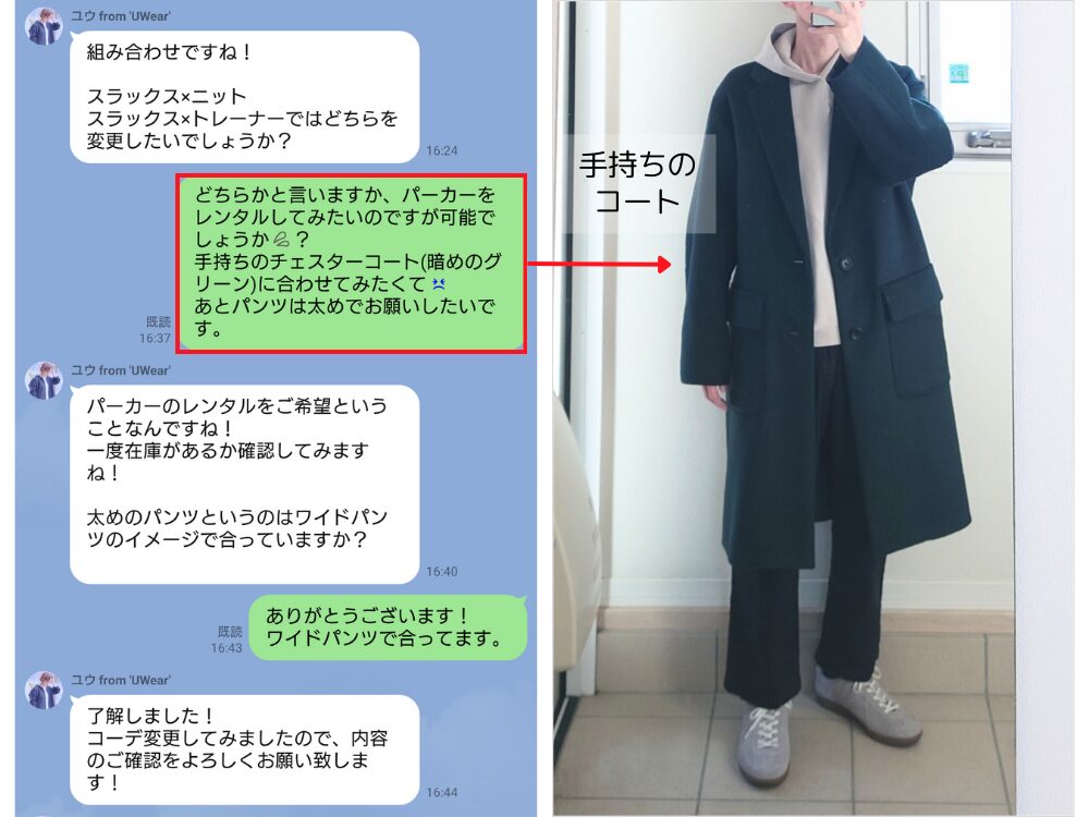 「このコートを使いたい」と伝えれば、それに合う服を選んでくれます。(写真を送ることも可能)