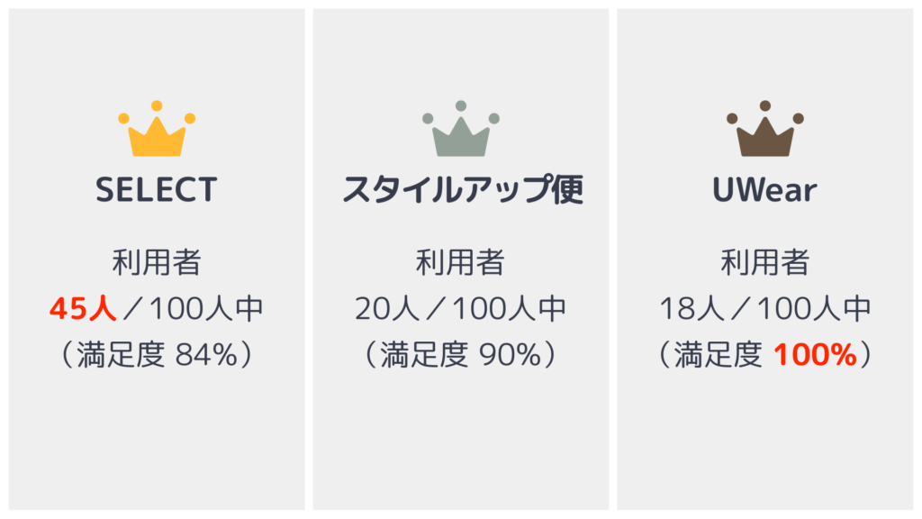 そこで、100人に聞いた独自アンケートの結果をもとに『メンズに人気の服サブスク3選』を紹介します。実体験をもとにした、各サービスの注意点つきです。
