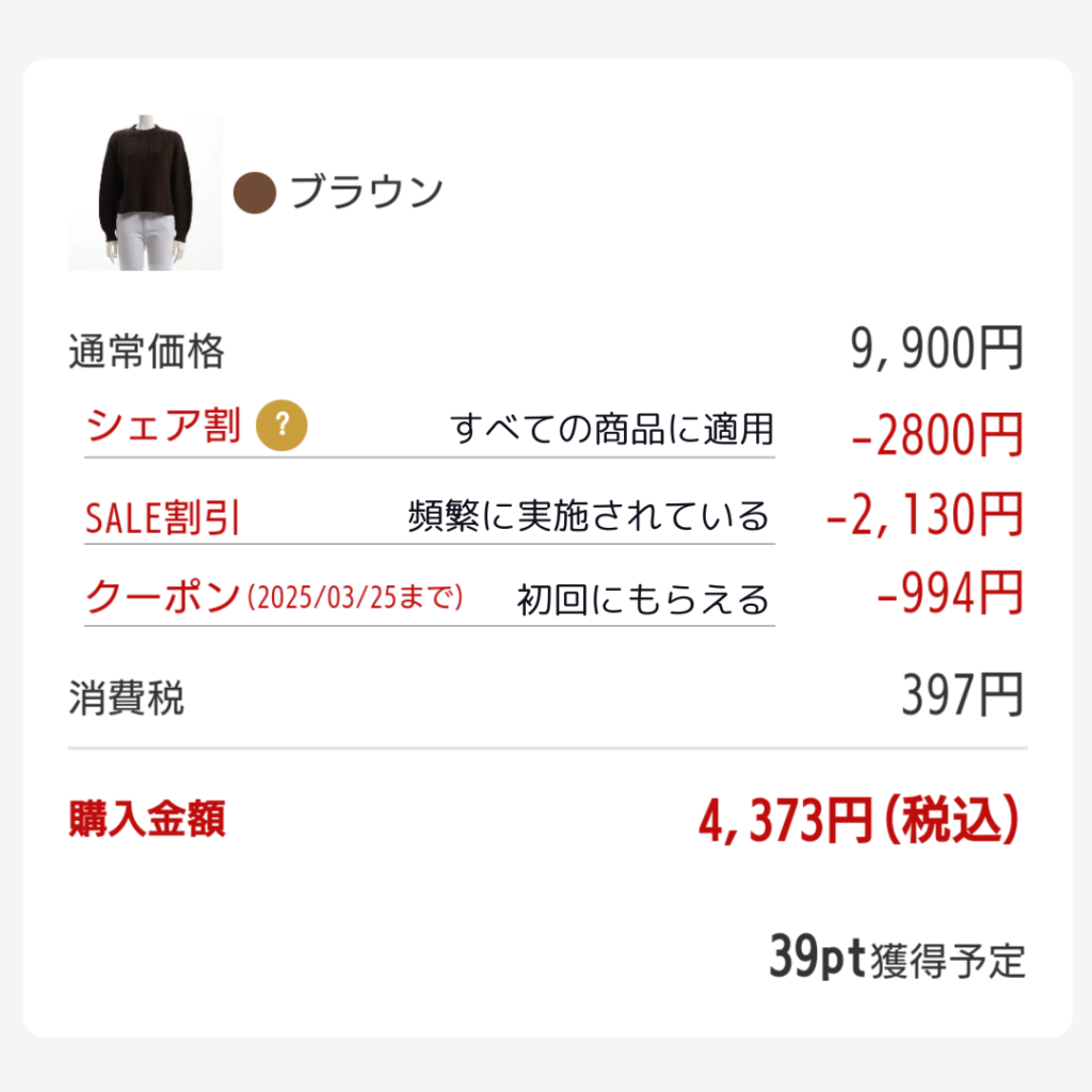 価格は、すべての服に適用されるシェア割やSALE割引などで値引きされた金額です。