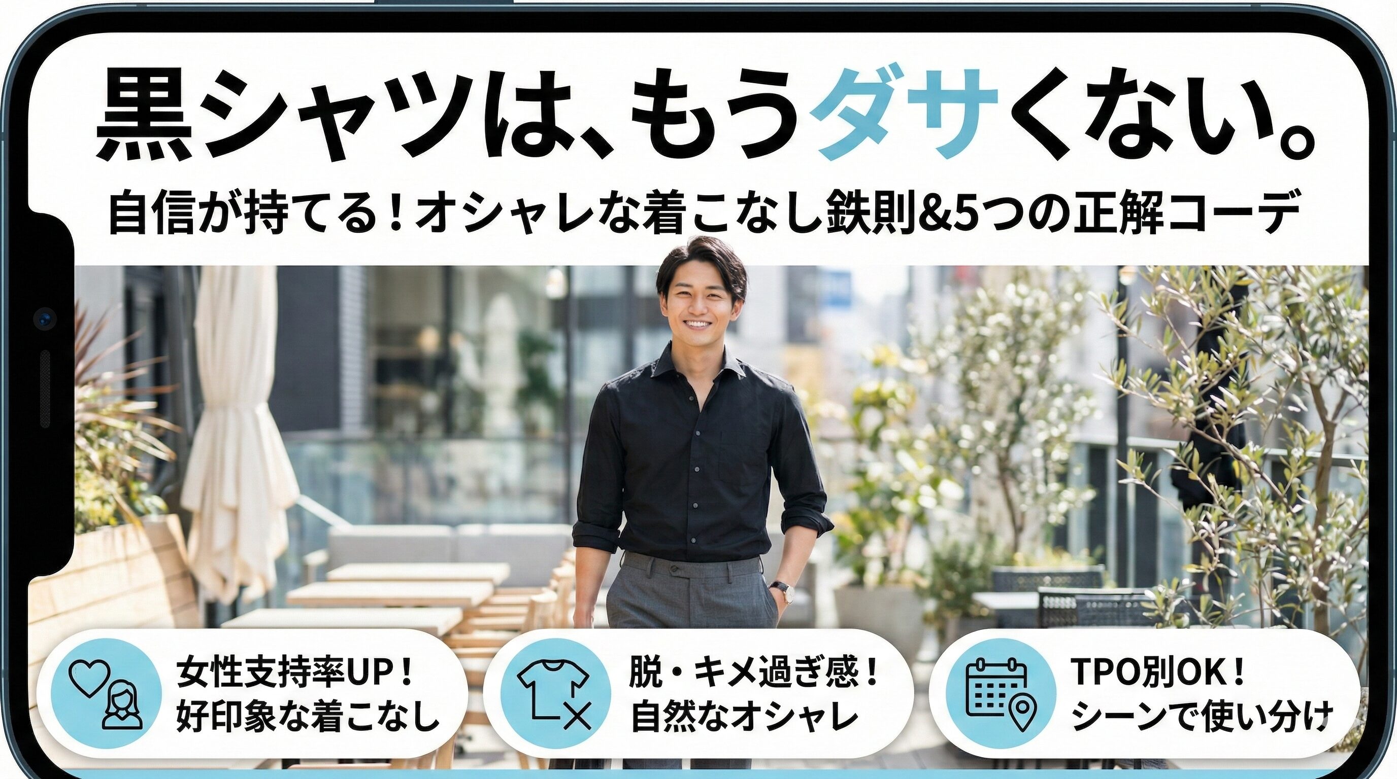 黒シャツコーデをオシャレに見せる、簡単な方法を紹介します。ポイントは次の3つです。