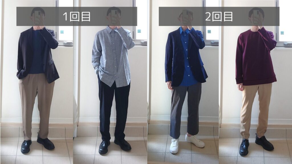 アイテム数 | 5点 (トップス・パンツ) | 6点 (アウター含む) | 4点 (ジャケット含む) |