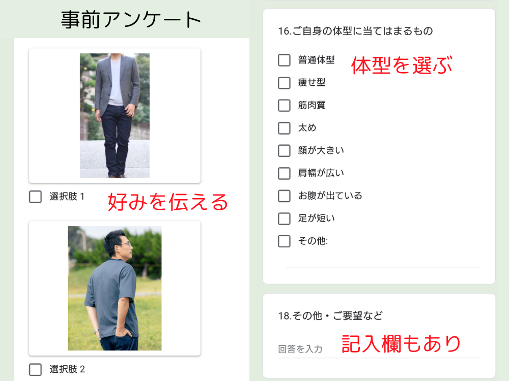 「トップスはポロシャツにしてほしい」などの細かな希望も、アンケートやLINEで伝えれます。