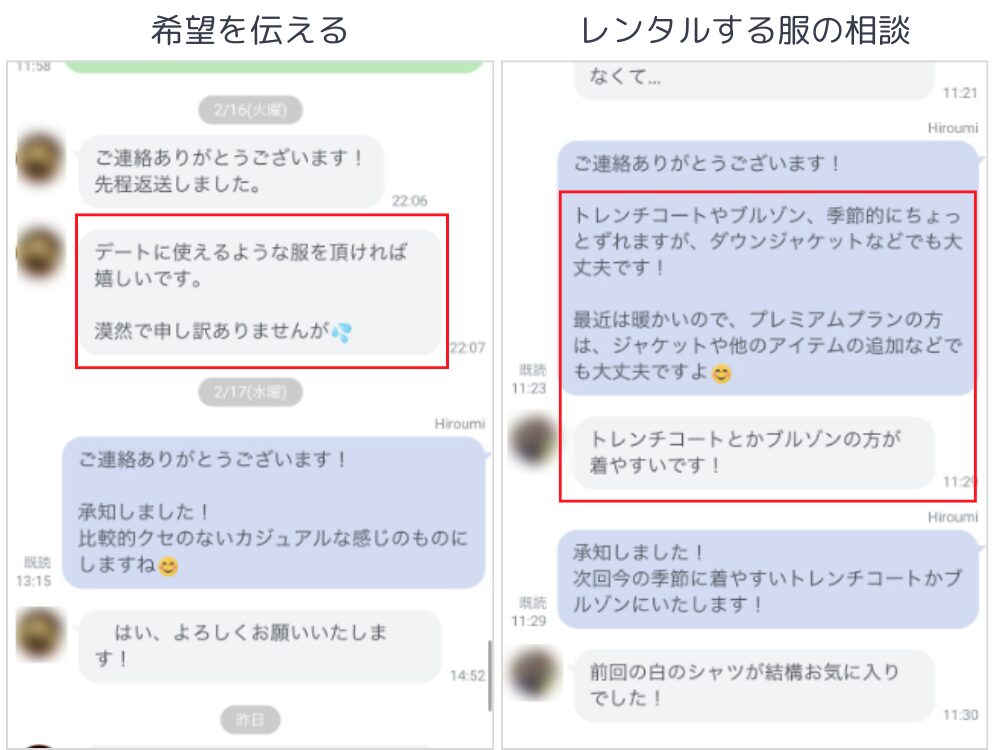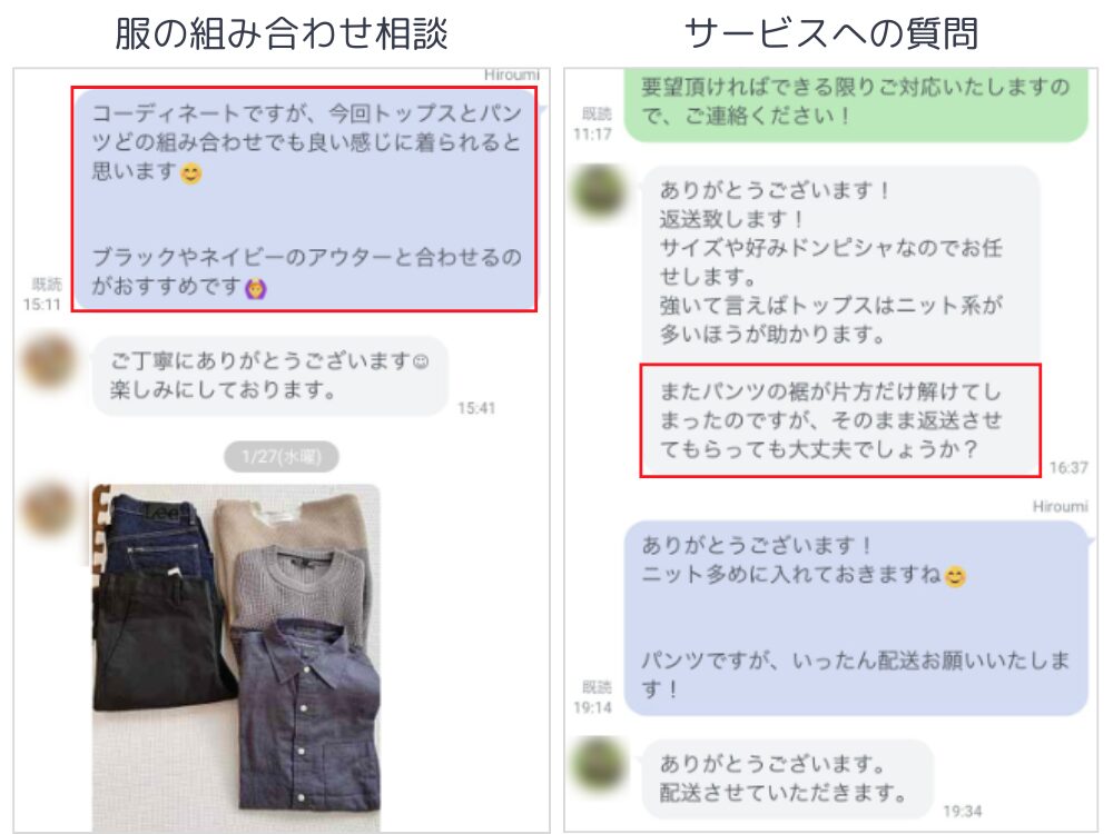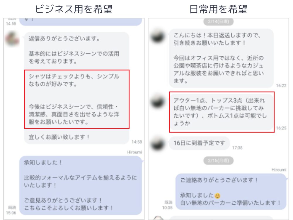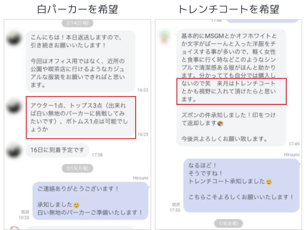 ただし、服の種類やカラーの希望なら伝えられます。スタイリストにLINEで伝えれば、可能な範囲で対応してくれます。